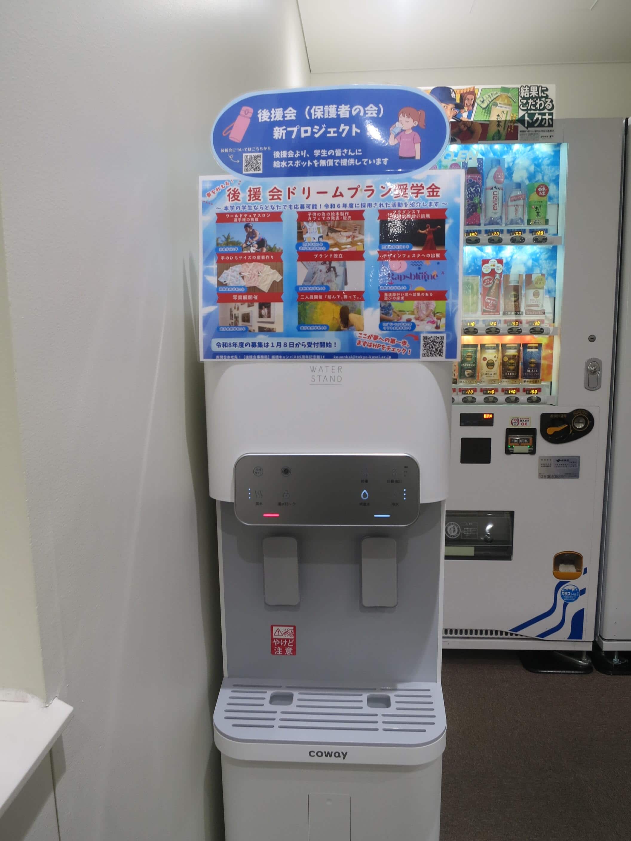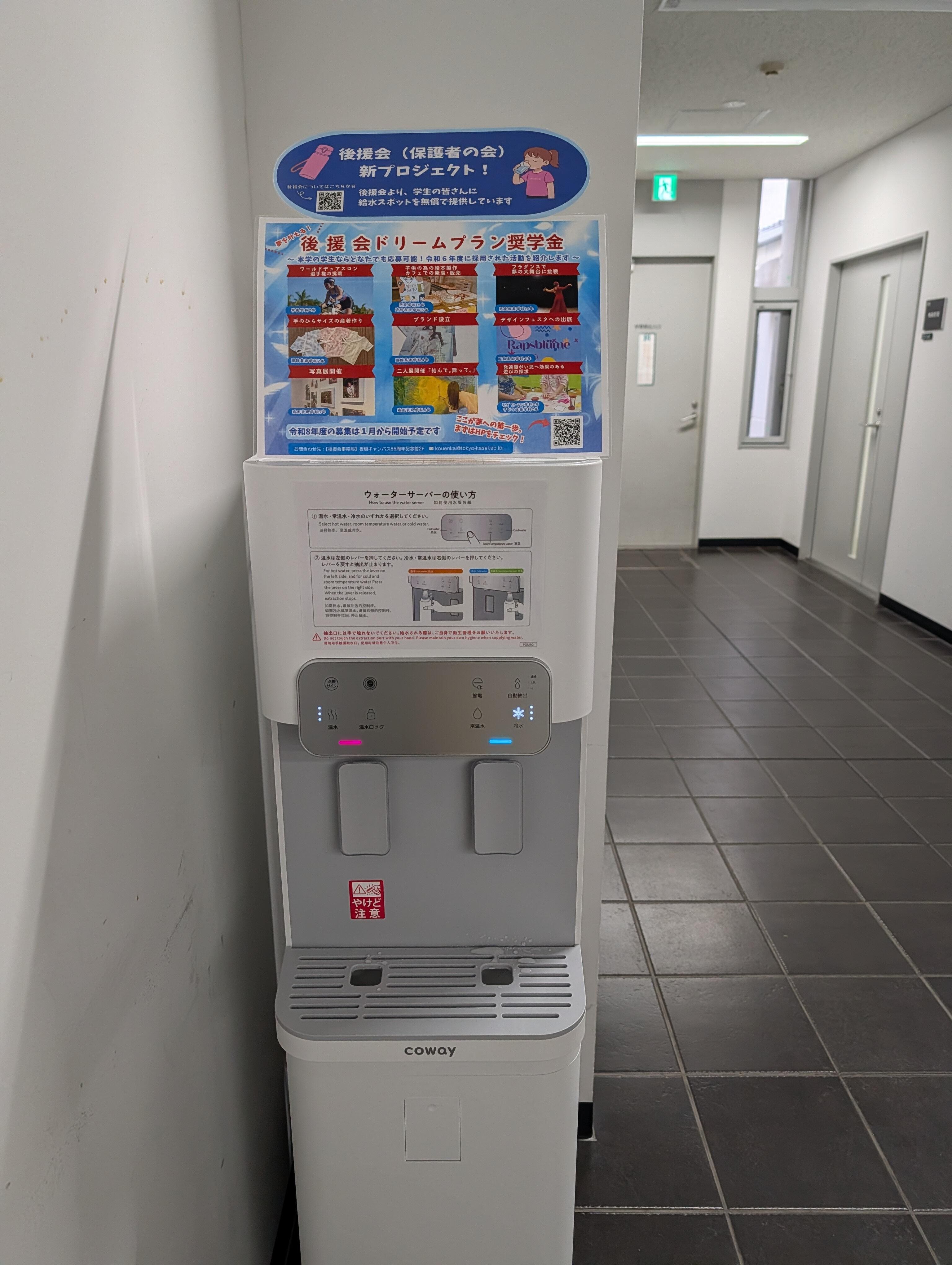 後援会より新規給水機設置のお知らせ令和7年度後援会(保護者の会)より、学生の皆さんが快適に学べる環境づくりとして、給水機を新たに板橋校舎14号館1Fエントランスホール及び狭山校舎6号館1Fラウンジに提供、設置いたしました。マイボトルを持参してご利用ください。