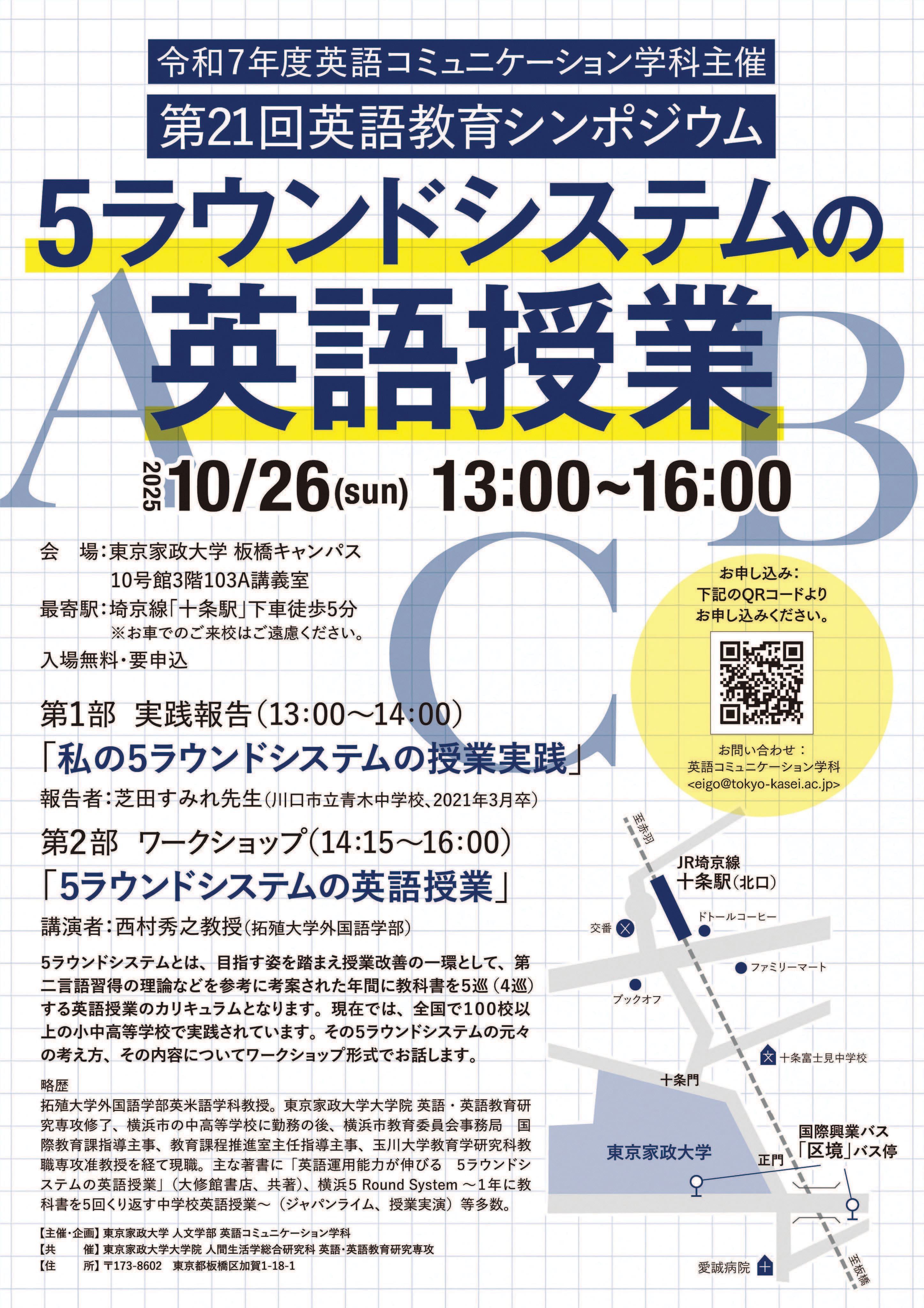 英語教育学概論Ⅰ、英語教育学概論Ⅱ、英語科教育法Ⅳ、小学校英語指導法、小学校英語内容論、基礎ゼミナール、Reading & Writing for Communication -