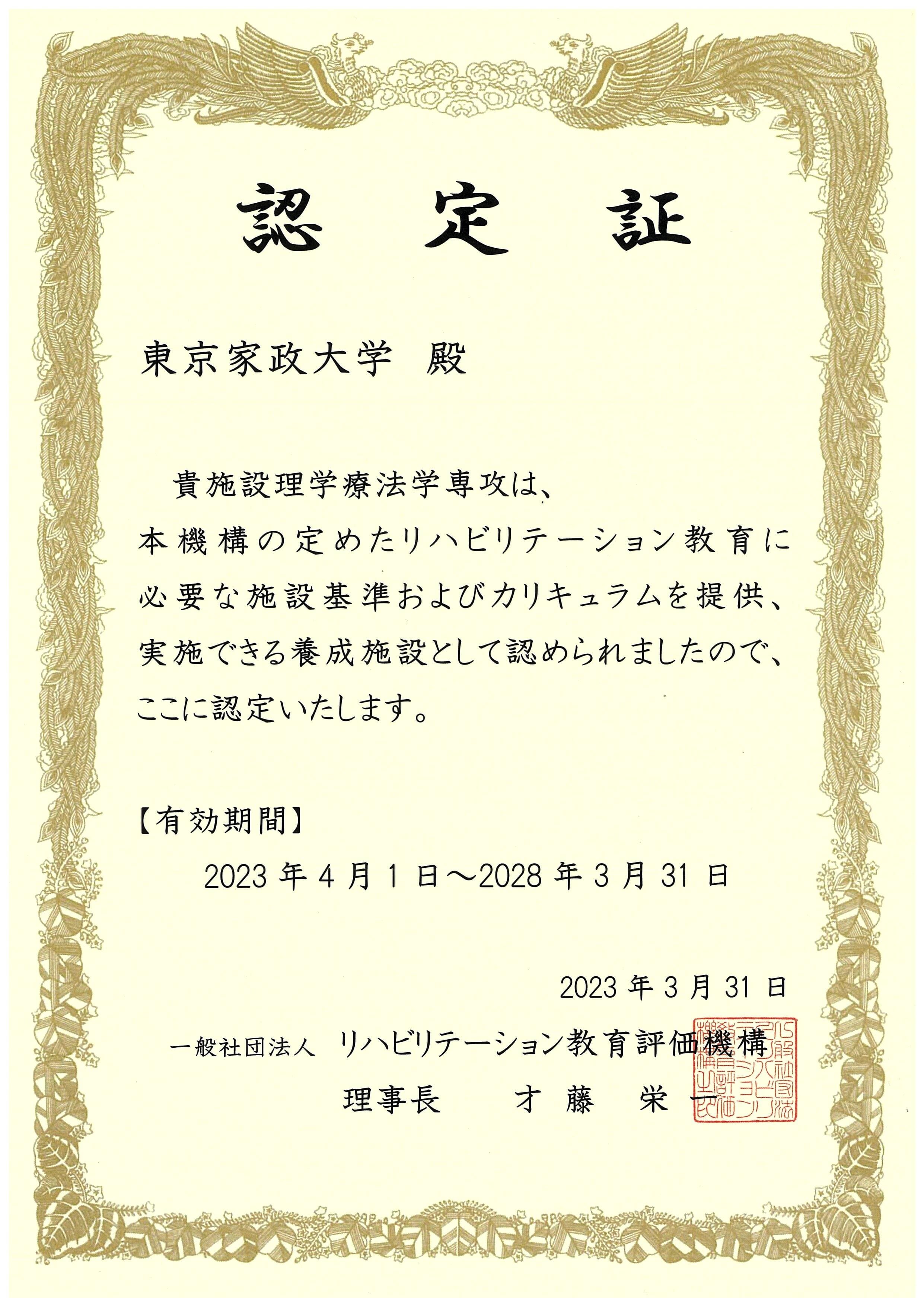 作業療法学専攻と理学療法学専攻は、一般社団法人リハビリテーション教育評価機構※における教育評価認定の審査を受け、機構が定める評価基準を満たし、リハビリテーション教育に必要な施設基準およびカリキュラムを提供、実施できる養成施設であると認められました(2023年3月31日付)。