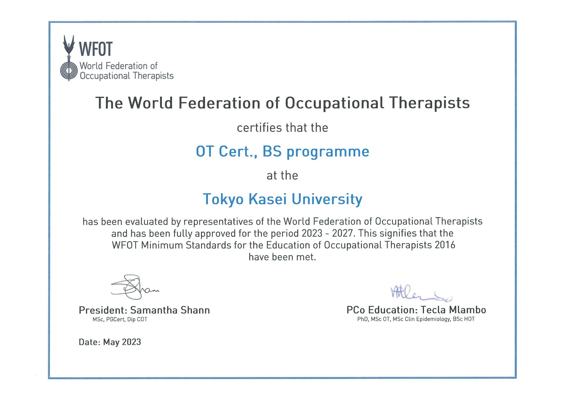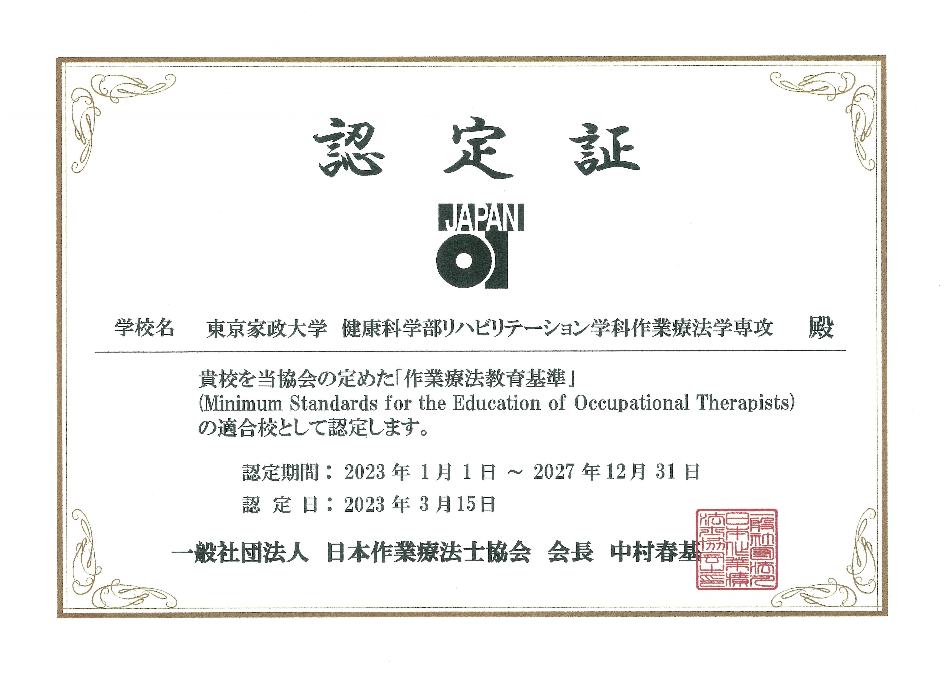 また、作業療法学専攻は、日本作業療法士協会および世界作業療法士連盟(WFOT)の「作業療法士教育基準」の条件を満たしていることが認められ、日本作業療法士協会およびWFOTの認定校として登録されました(2023年3月15日付)。これにより、作業療法学専攻の教育課程を修了し、国家資格を取得すれば、海外で作業療法士として活動することができます。