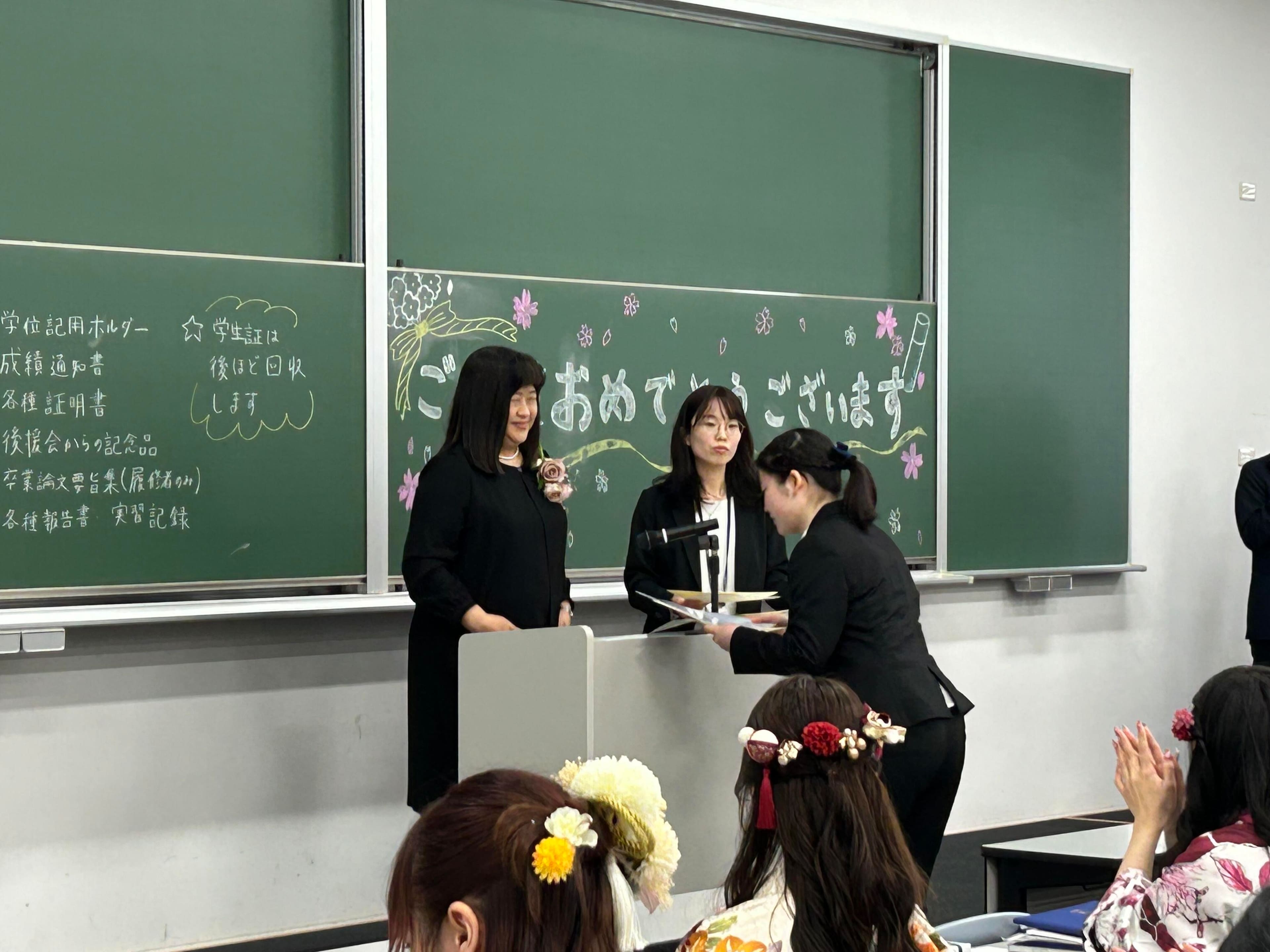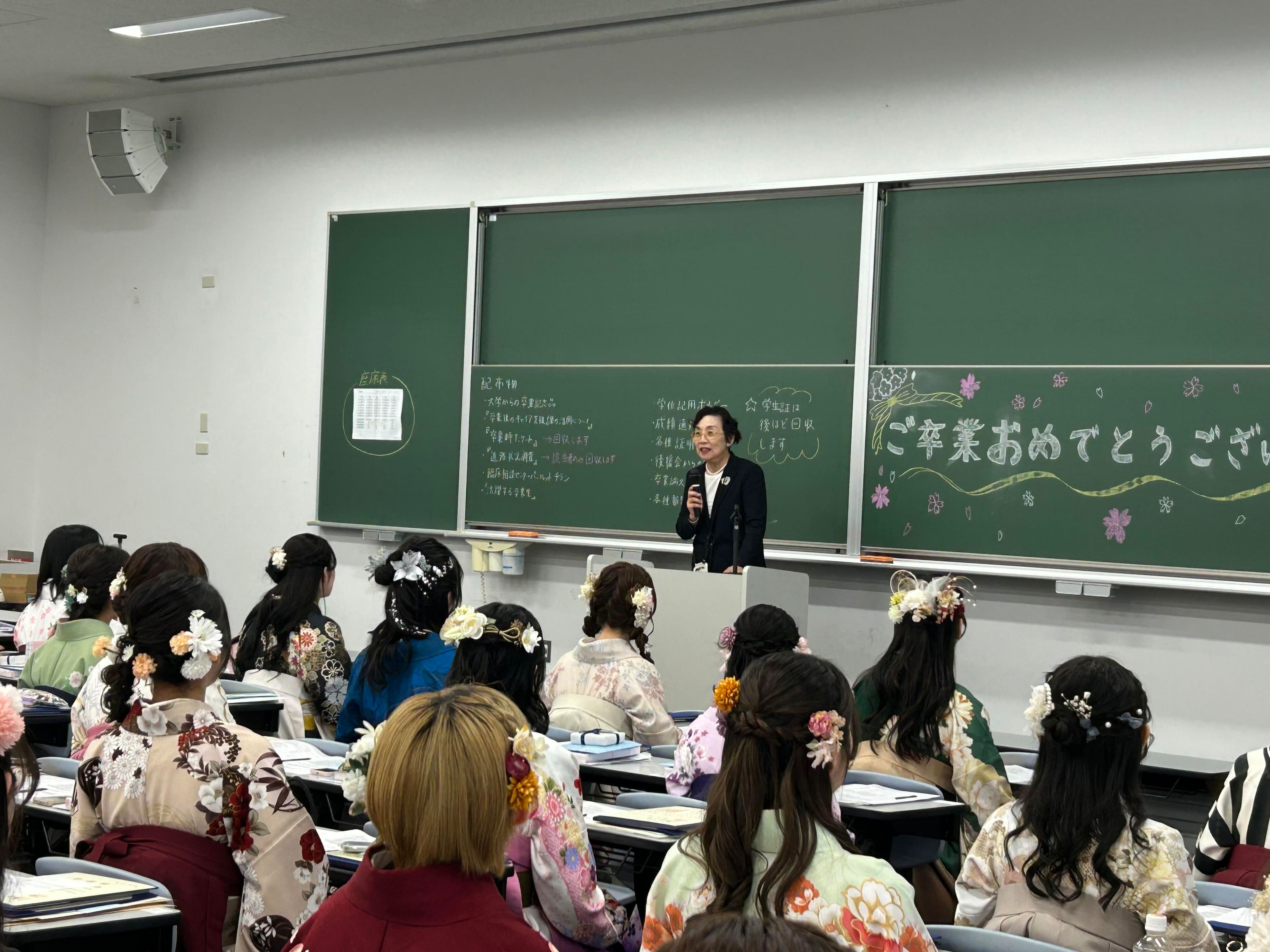 クラス懇談会では、学位記の授与のあと教員一人ひとりからメッセージが送られました。
