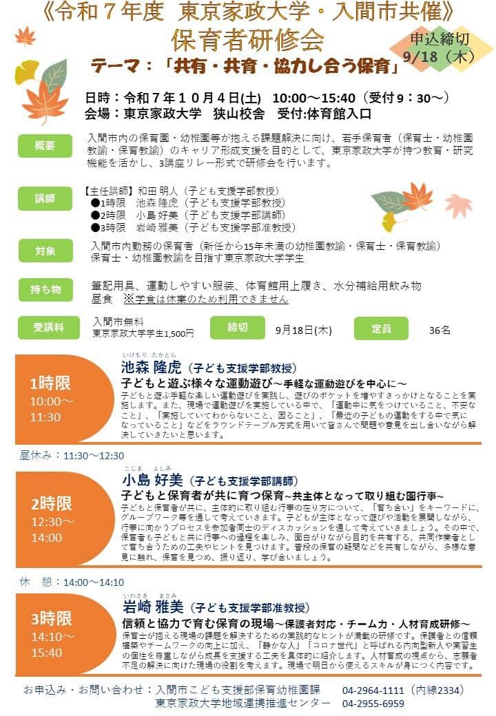 | 対象 | 入間市内の保育施設に在籍の新任から15年未満の保育士(幼稚園教諭・保育士・保育教諭)、幼稚園教諭・保育士を目指す本学学生 ※学童保育者は含まれません |