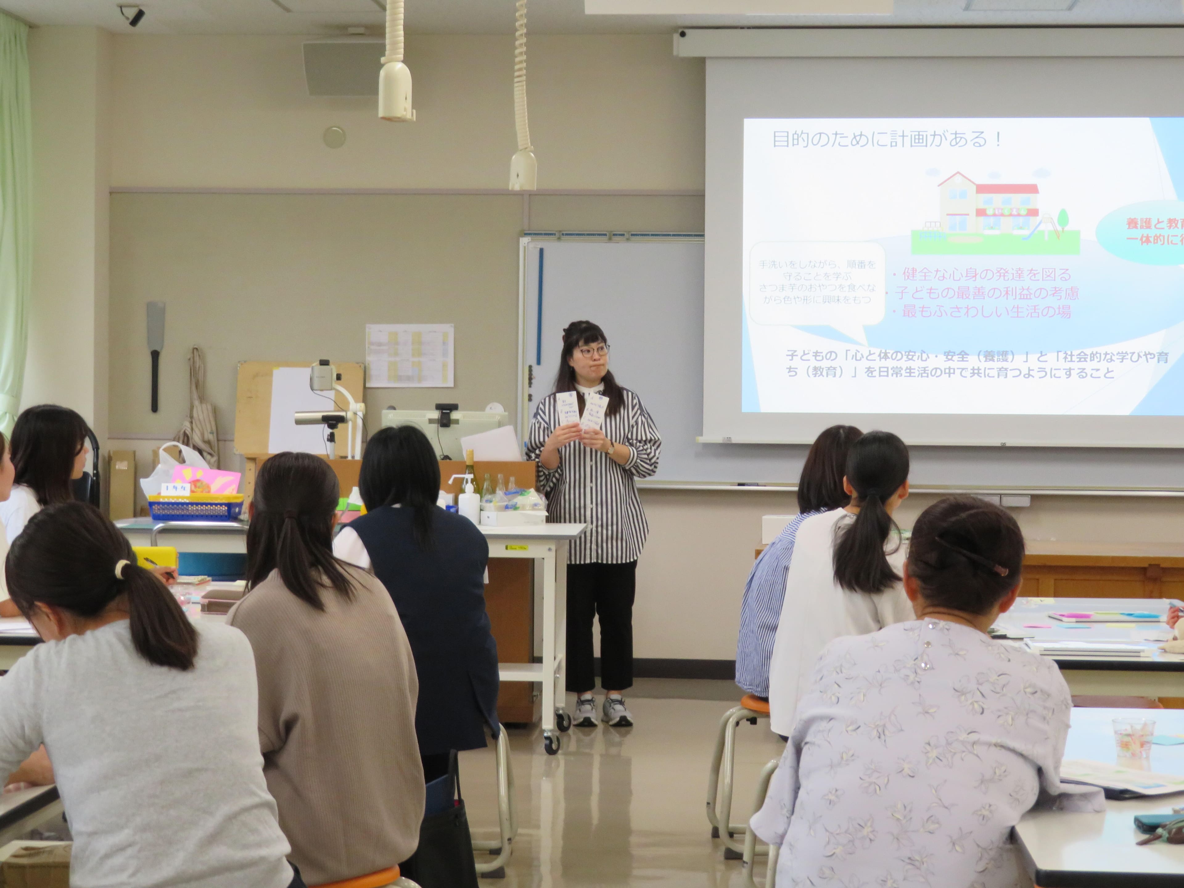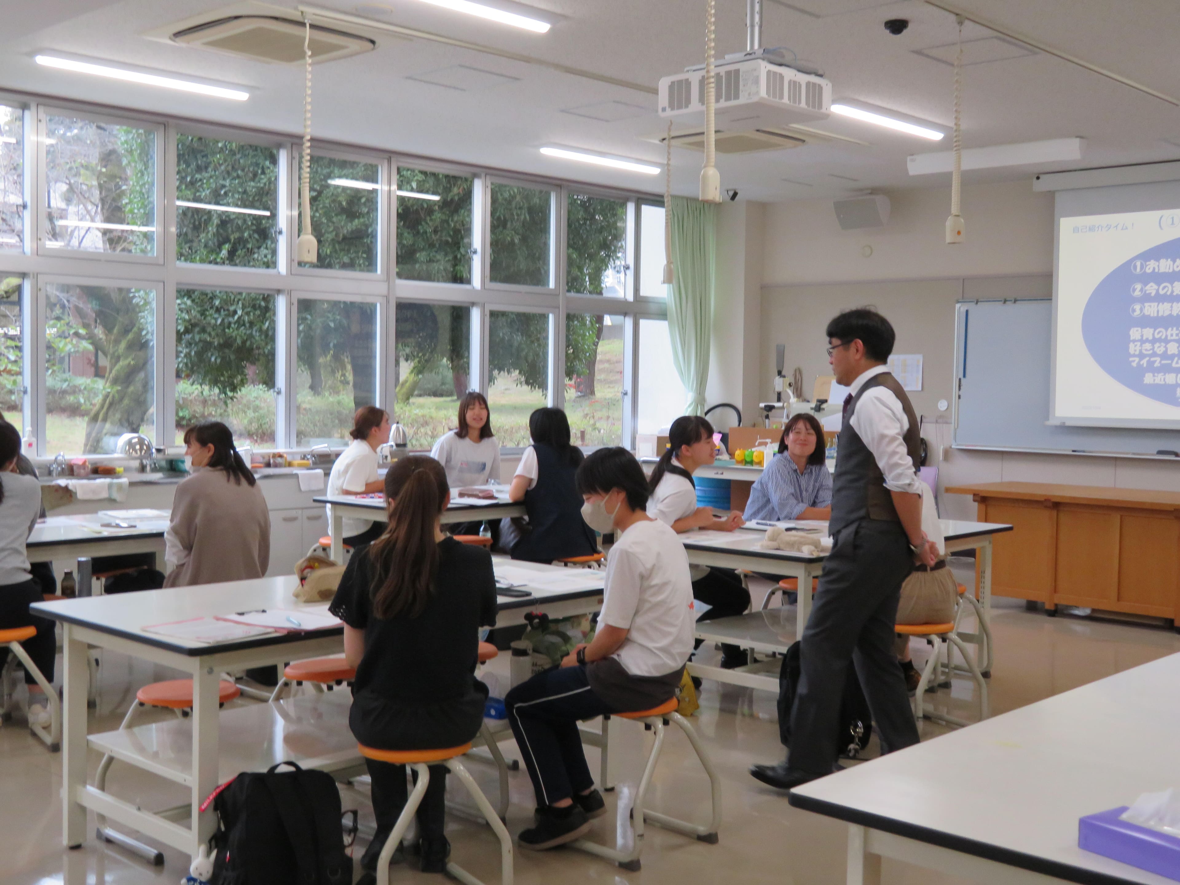 | 4限 | 14:10~15:40 | 講義信頼と協力で育む保育の現場~保護者対応・チーム力・人材育成研修~保育士が抱える現場の課題を解決するための実践的なヒントとするため、保護者との信頼構築やチームワークの向上に加え、内向型新人や実習生の個性を尊重しながら成長を支援する工夫を具体的に紹介した。人材育成の視点から、志願者不足の解決に向けた現場で明日から使えるスキルが身に付くような講義を行った。 |