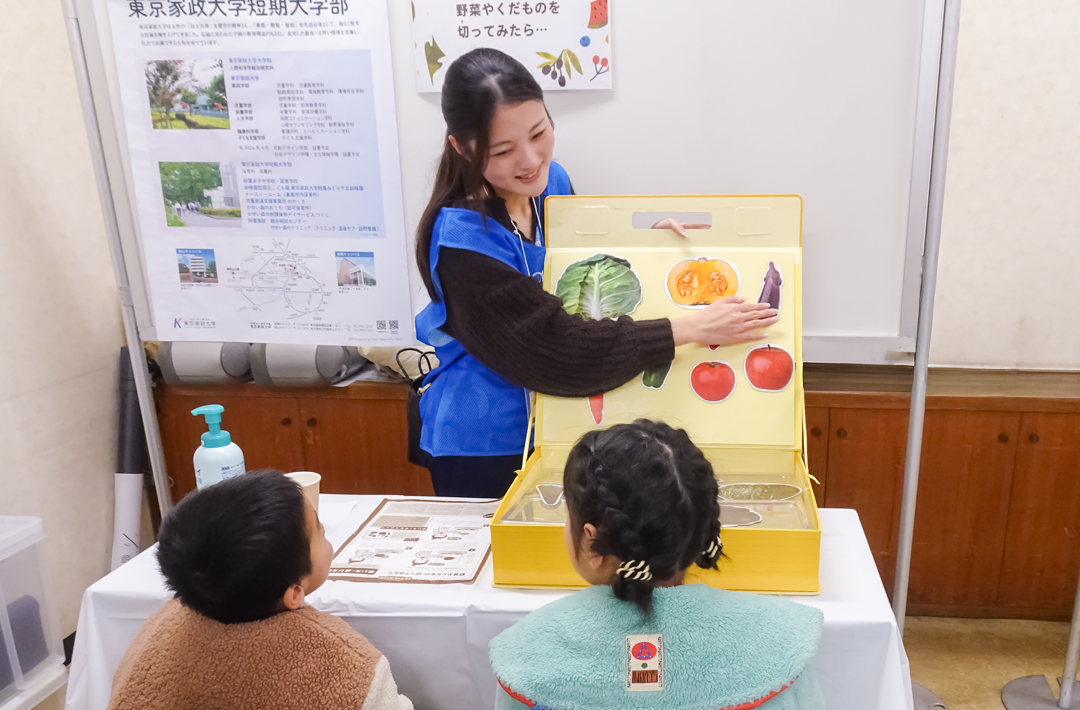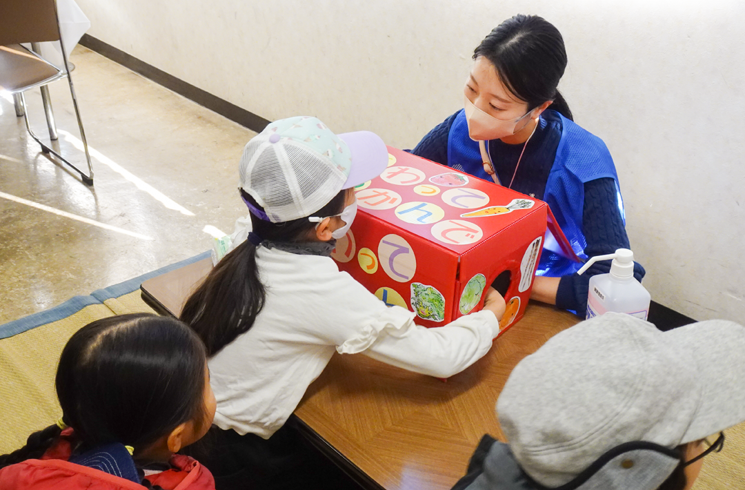 4年ぶりに学生の参加を再開し、11名の学生が参加しました。当センターは「食育おもちゃとあそぼう」というブースを出展し、学生が食育おもちゃやマグネットシアターを使ったゲームを実施し、お子さん連れのご家族を中心とした地域の方々と交流することができました。