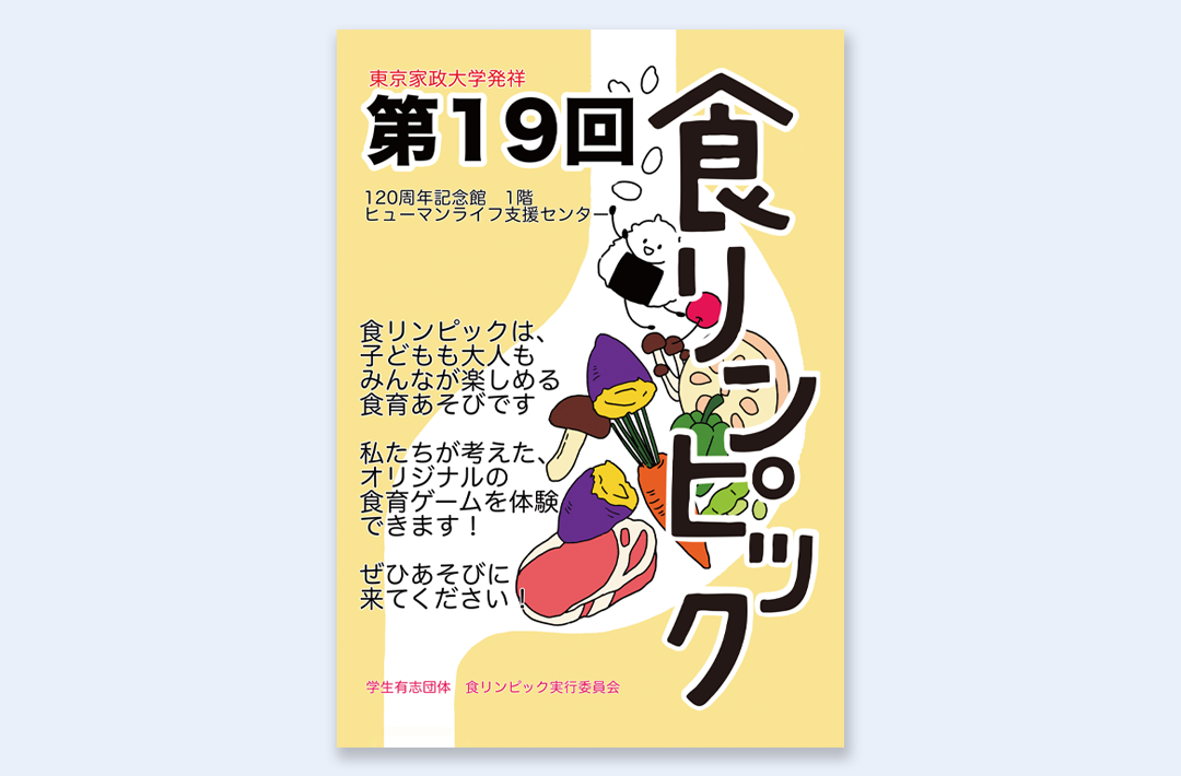 概要 :子どもから高齢者まで、幅広い世代の方々が五感を使った食育ゲームを競技形式で楽しむ本学発祥の食育イベントです。イベントの企画から競技の考案、ポスター制作などの広報活動まで、学生有志団体 食リンピック実行委員会が主体となり運営しています。食リンピック実行委員会では、様々な学部学科・科の学生が協力し、それぞれの学びや特技を活かして活動しています。