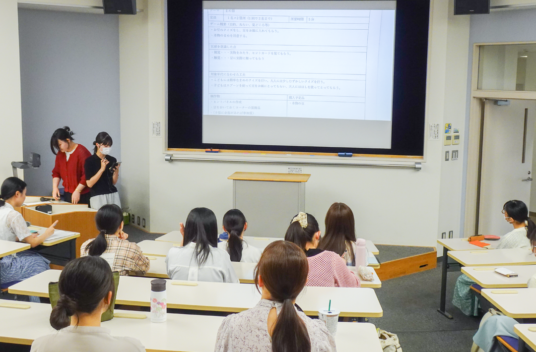 2024年度は、板橋キャンパス緑苑祭に出展し、2日間に渡り開催しました。6つの班に分かれて準備を進め、ヒューリップからのアドバイスや学生同士での意見交換を経てブラッシュアップを重ね、6種類の食育ゲームが完成しました。緑苑祭では、子どもから大人までたくさんの方に食育ゲームを楽しんでいただき、参加者からは、「説明が丁寧でわかりやすかった」「楽しみながら勉強できた」といった声が聞かれました。また2月には、附属みどりケ丘幼稚園で「ミニ食リンピック」を開催し、8名の学生が参加しました。幼稚園では、遊戯室で2種類の食育ゲームを行い、園児たちは楽しそうに挑戦していました。学生は、園児との交流を楽しみながら、食育を通して子どもとの関わり方も学んだ様子でした。