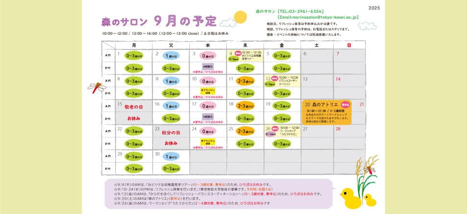 ※電話受付時間は、森のサロン開室時間とは異なります。予定表、利用案内をご確認のうえ、お越しください。