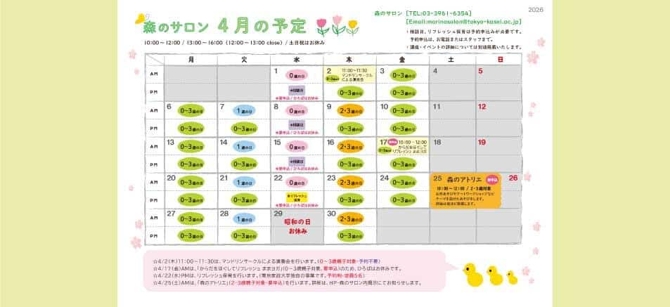 ※電話受付時間は、森のサロン開室時間とは異なります。予定表、利用案内をご確認のうえ、お越しください。