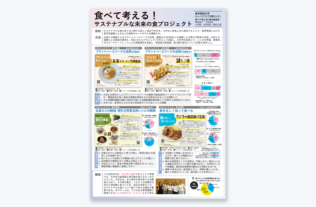 「⾷べて考える! サステナブルな未来の⾷プロジェクト」は、サステナブルな⾷のあり⽅に関する新しい視点や学びを、⼤学⽣に実⾷と共に提供することで、教育現場における産学官連携による⼤⼈の⾷育のロールモデルを構築することを目的としたプロジェクトで