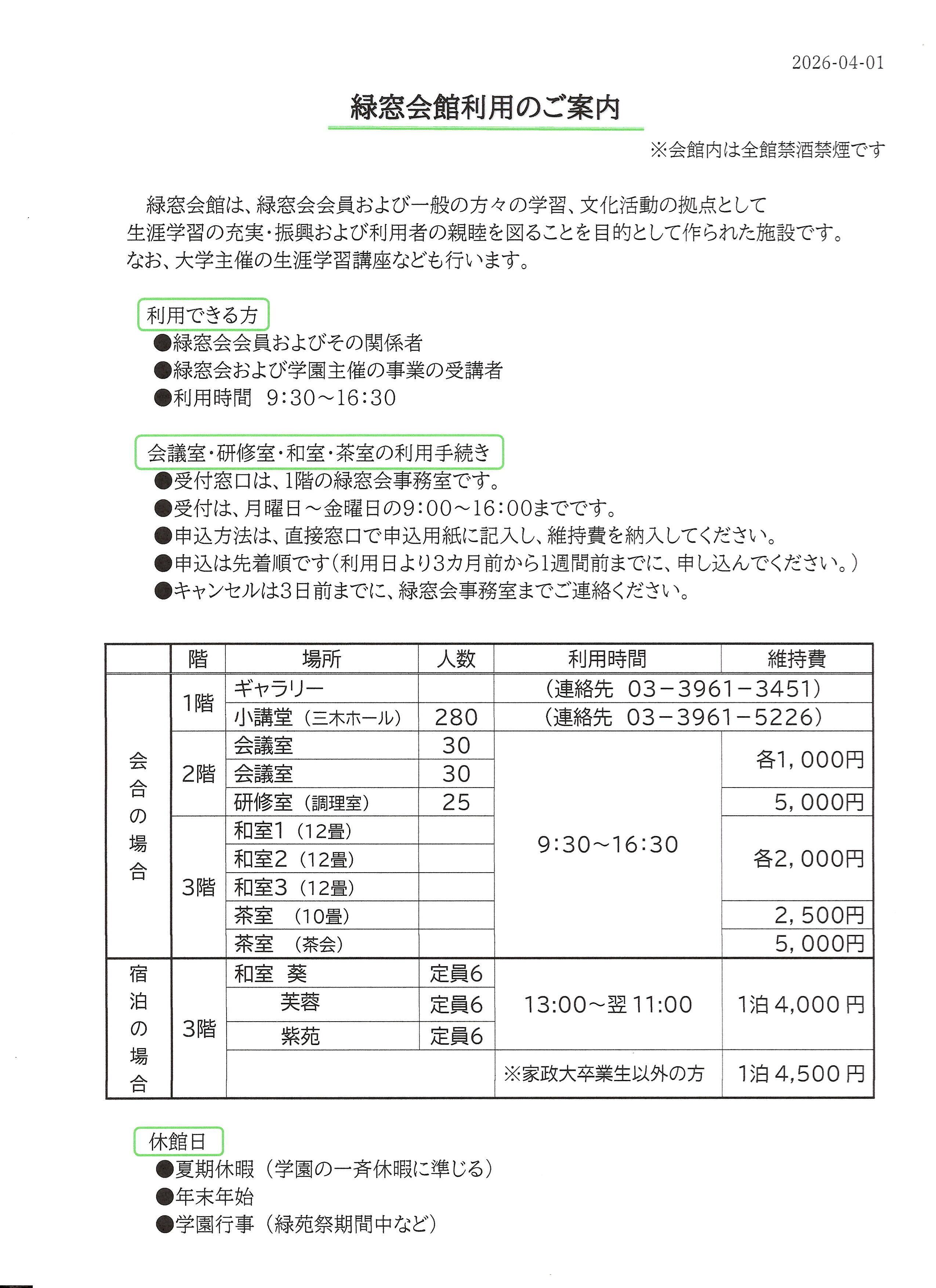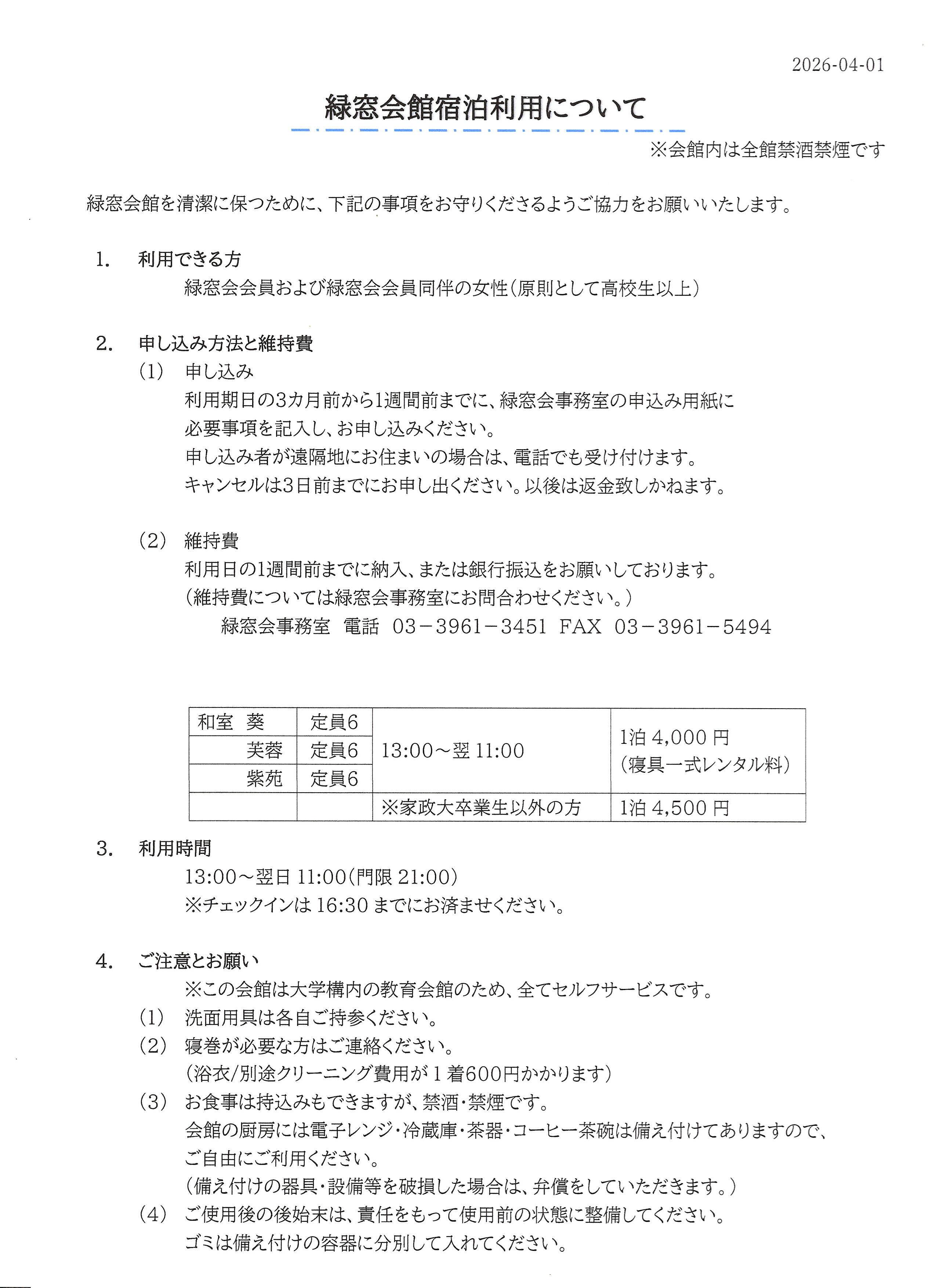 〇ご宿泊案内⇒緑窓会館宿泊利用について